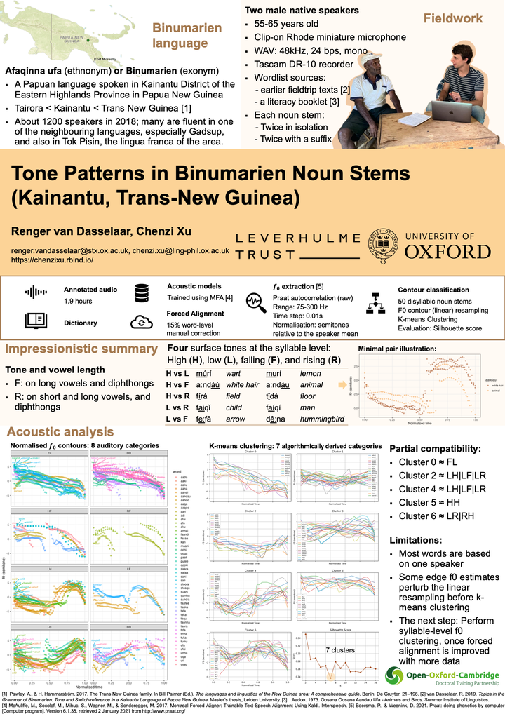 Acoustically, the f0 contours of 50 disyllabic noun stems (coded in different colours) are shown in the poster, grouped in eight preliminary clusters. The eight clusters were based on the visual inspection of the surface f0 contours. Variations within each cluster can be partially attributed to the differences in syllable structure among these words. Some clusters may appear similar but serve to differentiate word meanings. For example, the f0 contours of the minimal pair of aandau are illustrated in the poster, where the two f0 patterns, LH and LF, are affiliated with different word meanings (‘white hair’ and ‘animal’). This empirical study contributes to our knowledge of the Binumarien tonal system. We are collecting more data on a variety of speech materials from additional speakers to generalise our findings and gain deeper insights into the tonal system, distinct from many Southeast Asian varieties.